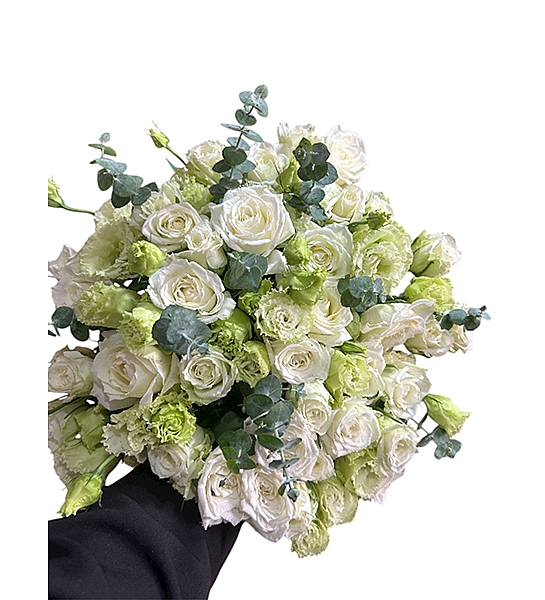 Beyaz güllerin arasına yerleştirilmiş yeşil karanfiller ve okaliptus dallarıyla tamamlanan bu tasarım; doğum günü, nişan, düğün kutlaması, hastane ziyareti veya taziye gibi her duyguya eşlik edebilecek çok yönlü bir seçenektir.