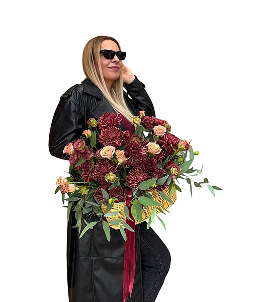 Bordo Krizantem ve Somon Gül Aranjmanı, derin bordo çiçeklerin asil duruşunu, somon güllerin zarif dokusuyla buluşturur. Hasır sepet içindeki tasarımı, doğallığı ön plana çıkarırken bordo saten kurdelesiyle tamamlanır.