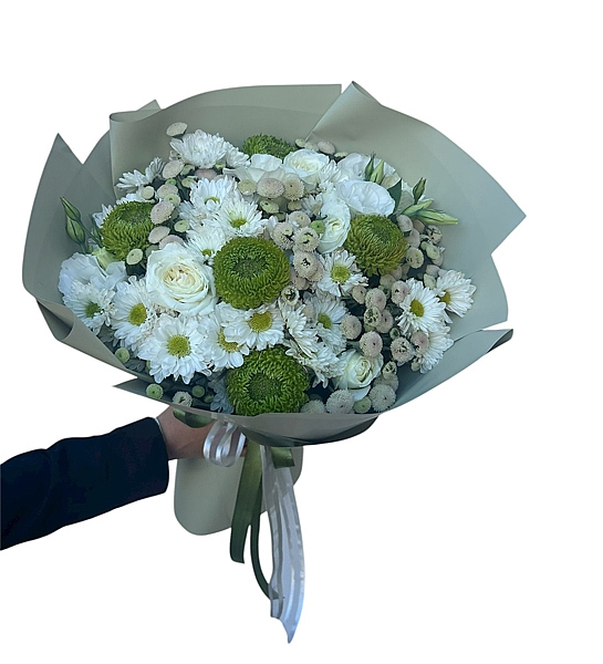 • Beyaz gül, beyaz krizantem ve yeşil pompon çiçeklerden oluşur